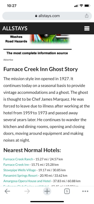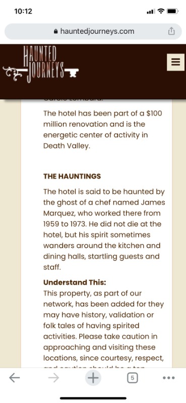 My father and I just finished a road trip from Reno to Vegas which included a stay at the Inn at Death Valley. We believe to have had an encounter with the spirit of Chef James Marquez. We did not believe in ghosts/spirits until our experience at the Inn's Dining Room...